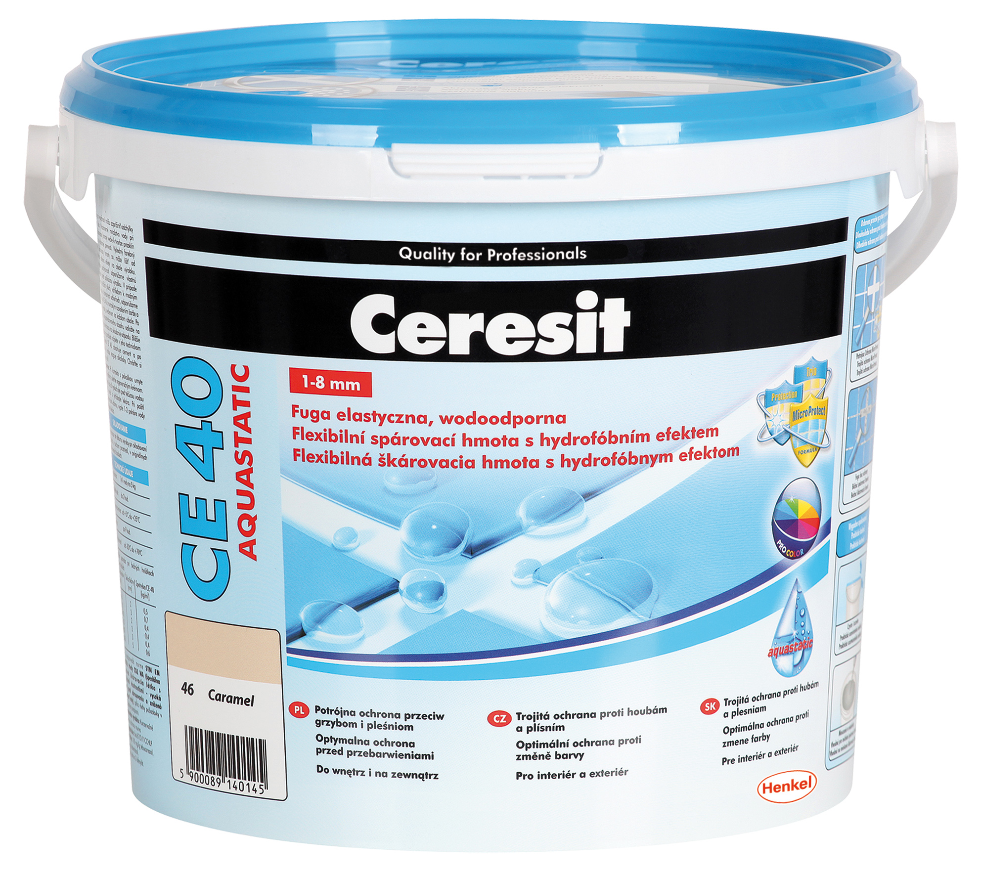 CERESIT fuga elastyczna do płytek CE 40 - 2 kg, 1-8 mm - zaprawa Ceresit CE 40 służy do spoinowania płytek gresowych, innych typów płytek ceramicznych, szklanych oraz kamiennych (również marmurów), zarówno na powierzchniach pionowych i poziomych. Potrójna Ochrona MicroProtect – formuła zawiera 3 specjalnie dobrane substancje czynne, które zapewniają długą i skuteczną ochronę przeciw grzybom i pleśniom. Formuła chroni nie tylko samą spoinę, lecz również przyległe do niej powierzchnie płytek (strefa inhibicji), zapewniając estetyczny wygląd okładziny ceramicznej. Efekt Aquastatic – powierzchniowe uszczelnienie spoiny (hydrofobizacja) powoduje, że krople wody utrzymują się w formie perełek na powierzchni fugi, co wydłuża znacząco działanie pleśniobójcze oraz chroni fugę przed zabrudzeniami. Zalety te umożliwiają eksploatacje spoiny w miejscach szczególnie narażonych na okresowe działanie wody np. łazienki, prysznice, kuchnie. Może być stosowana wewnątrz i na zewnątrz budynków. Szczególnie polecana, gdy płytki mocowane są na podłożach odkształcalnych: ogrzewane podłogi, płyty wiórowe i gipsowo-kartonowe. Wodoszczelność i odporność na oddziaływanie chemikaliów zapewnia stosowanie fugi Ceresit: CE 79. Dylatacje między płytkami, spoiny w narożach ścian, w połączeniach ścian z posadzką i przy urządzeniach sanitarnych należy wypełnić silikonem Ceresit CS 25 MicroProtect, a w przypadku spoinowania marmurów CS 29. W celu dodatkowego zabezpieczenia spoin i okładzin ceramicznych przed zabrudzeniami poprzez hydrofobizację, należy stosować silikonowy impregnat Ceresit CT 10.