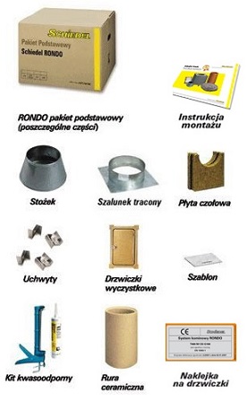 Schiedel RONDO оснащений додатковими елементами, які дозволяють побудувати повноцінний димохід. Дрібні елементи, необхідні для будівництва, входять в базову комплектацію.